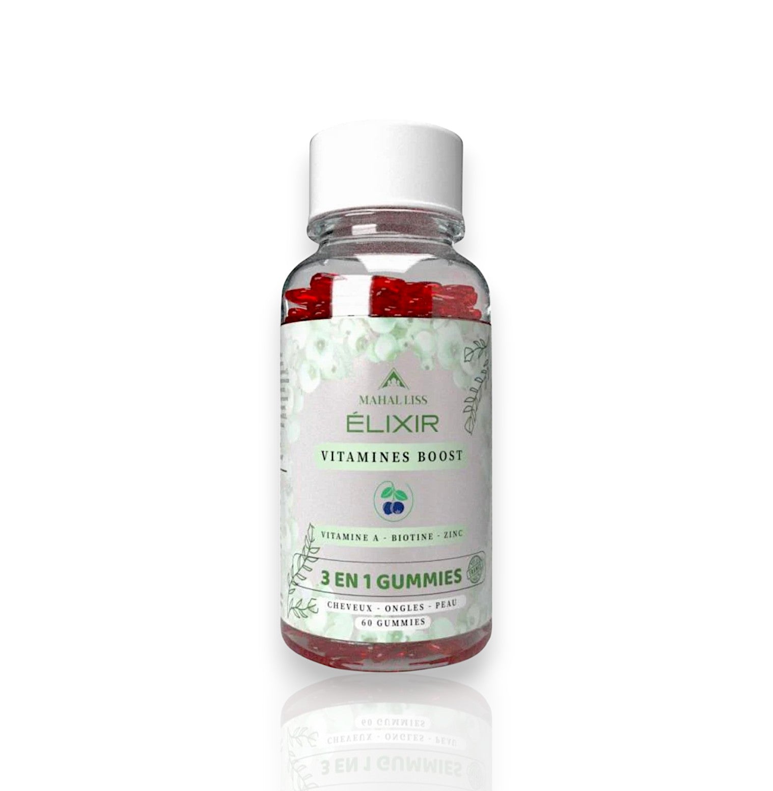 Sirop de Glucose, Sucre, Eau, Amidon de Riz, Gélifiant, Pectine, Acide Ascorbique (Vitamine C), Maltodextrine, Acidifiant : Acide Citrique, DL-alpha-tocophérol (vitamine E), Citrate de Zinc, Acidifiant : Citrate Trisodique, D-pantothénate de calcium (vitamine B5), huile végétale de noix de coco, acétate de rétinyle (vitamine A), chlorhydrate de pyridoxine (vitamine B6), ergocalciférol (vitamine D), arôme naturel, colorant : anthocyanes, cyanocobalamine (vitamine B12), d-biotine (vitamine B8), épaississant : cire de carnauba, acide folique (vitamine B9), iodure de potassium.